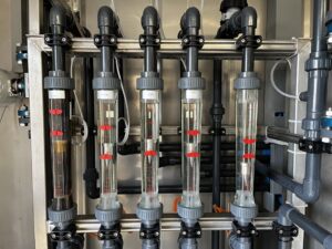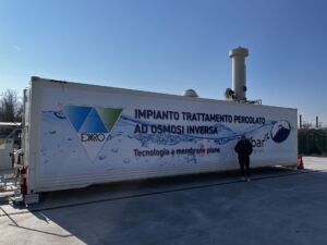 Da Gennaio 2023 è stato inserito nella sede principale questo impianto di trattamento del percolato che si genera in discarica ed attraverso l’osmosi inversa a membrane piane da 15.000 m3/anno di percolato si ottengono 10.000 m3/anno (pari al 68% dei volumi in ingresso) di acqua pulita e controllata da restituire all’agricoltura e si evita di trasportare il percolato su mezzi per destinarlo al trattamento nei depuratori.