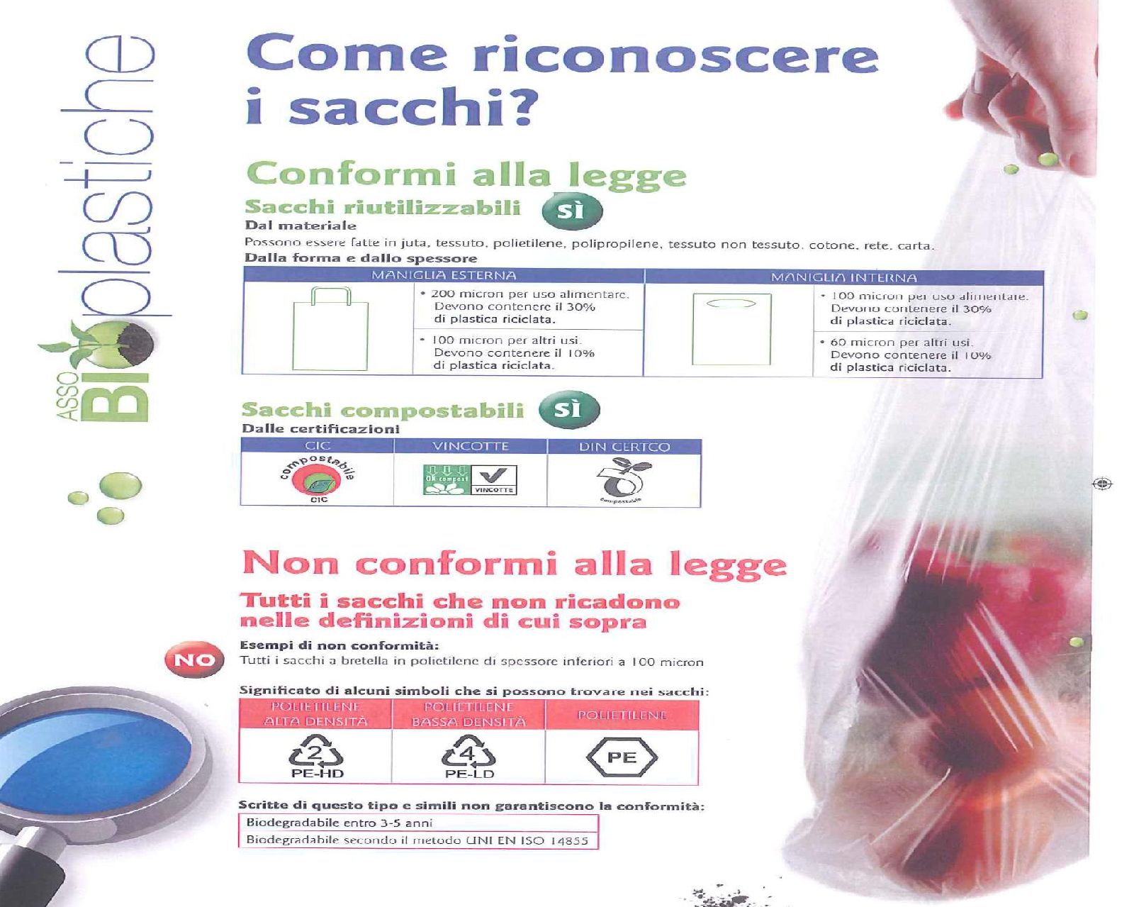Ricordiamo inoltre che i sacchetti biodegradabili possono anche essere conferiti nella plastica, perchè fino a una percentuale del 10 % possono essere recuperati con le plastiche tradizionali.